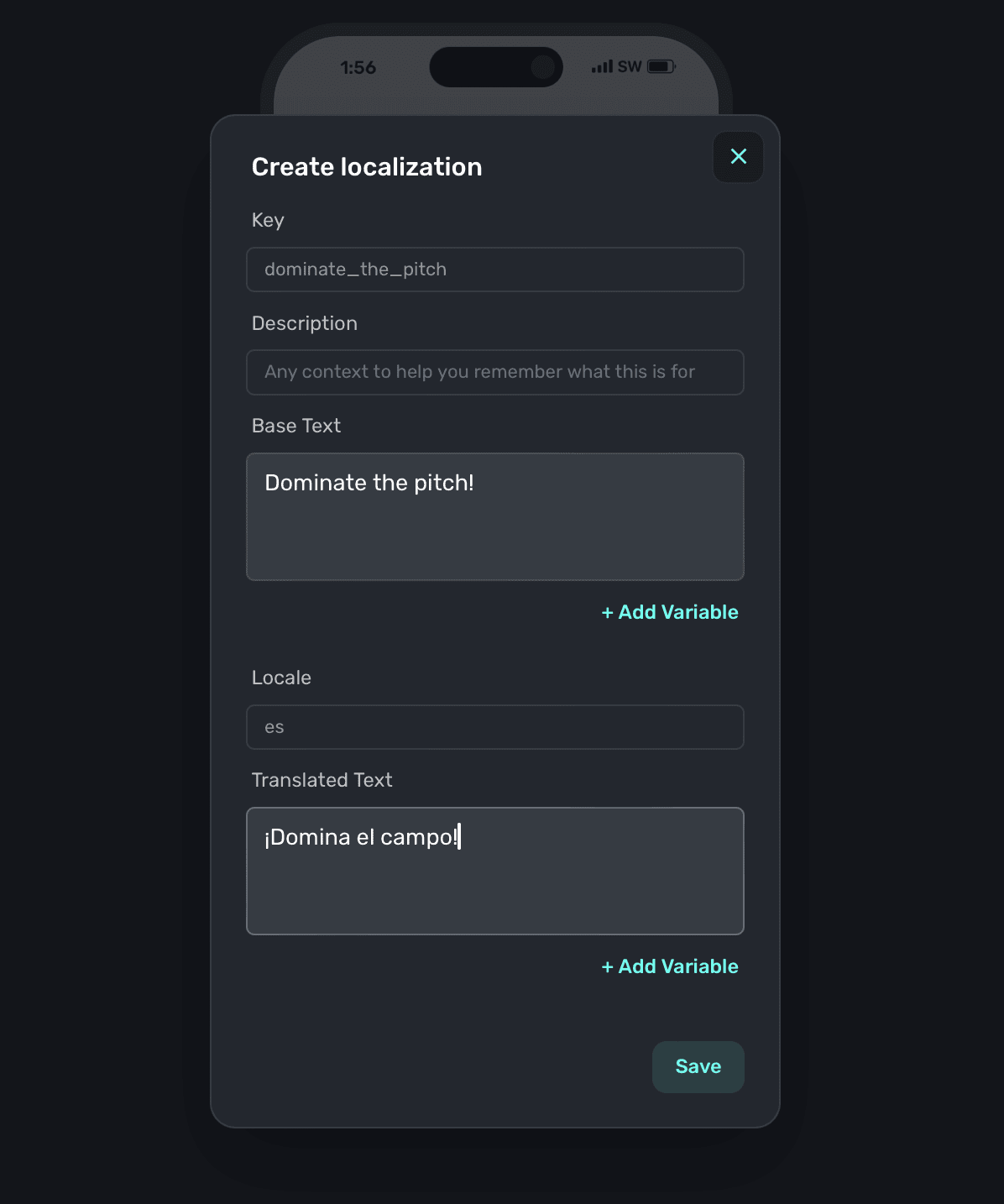 You can use variables with localized strings, too. Simply use liquid syntax within your localized string values to access any variable. Currently, variables themselves are not able to be localized. Learn more about using variables here.