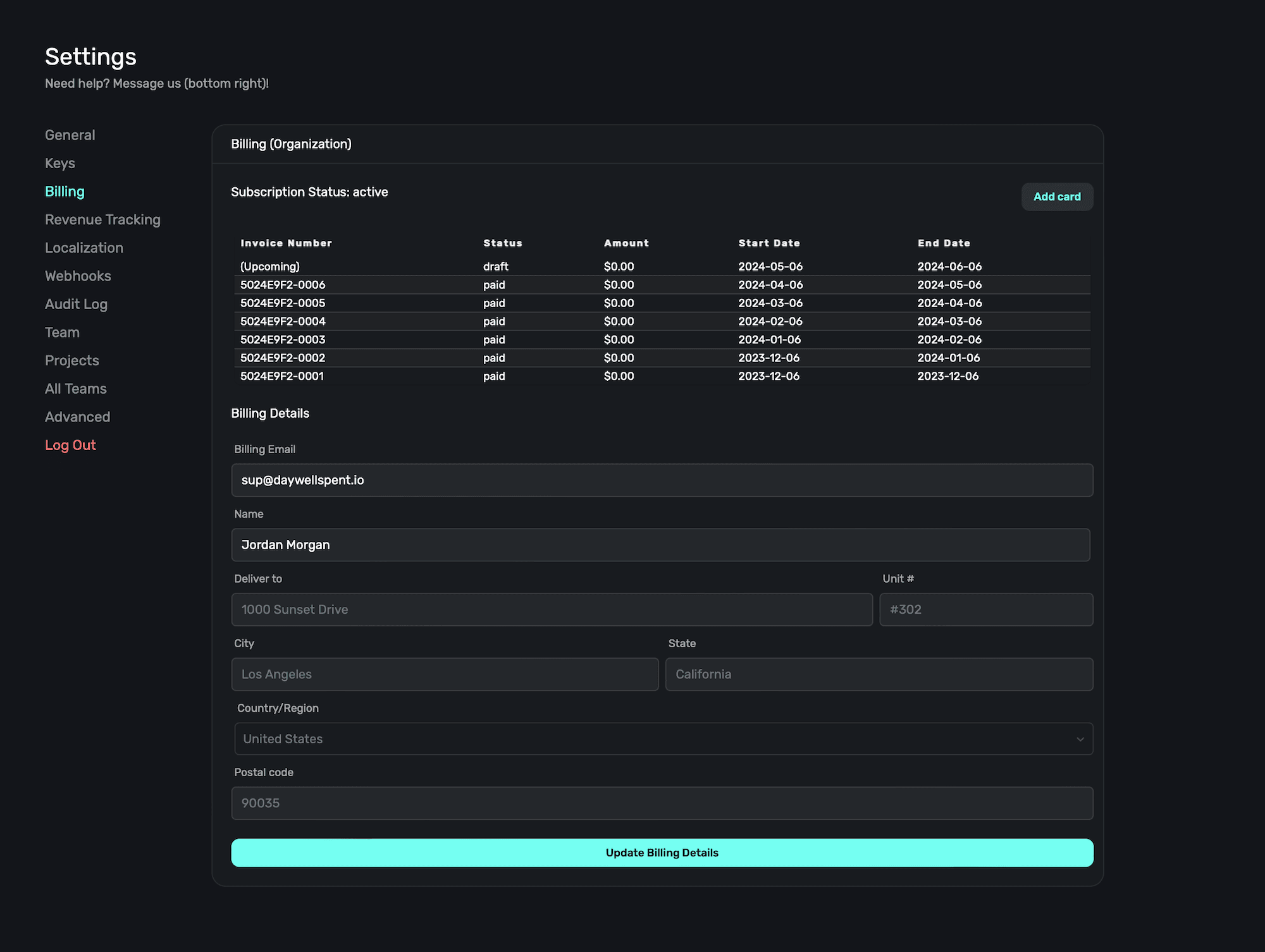 Below the invoice section, you can enter (or edit) your billing details at any point. When you're finished, click the Update Billing Details button to save your changes.